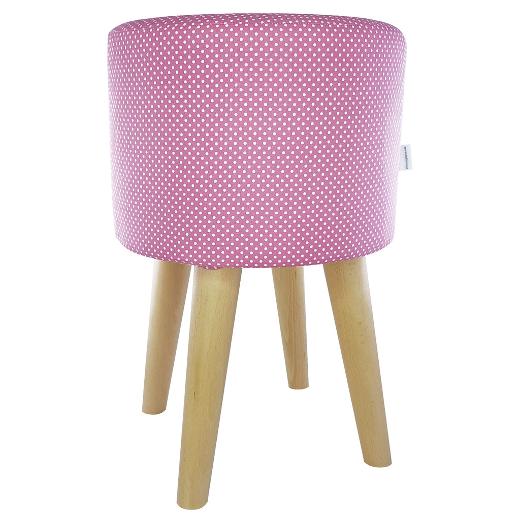 An eye-catching stylish stool (hassock), pouf with pink (magenta colour) round seat and removable cover with white dots, polka dots (small dots print). It fits various interiors, perfect for your living room or a bedroom.