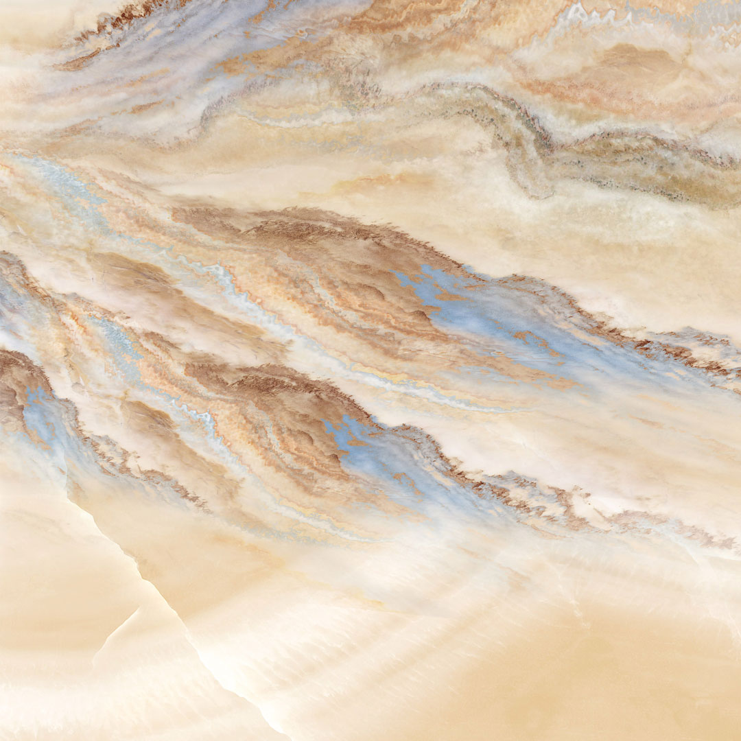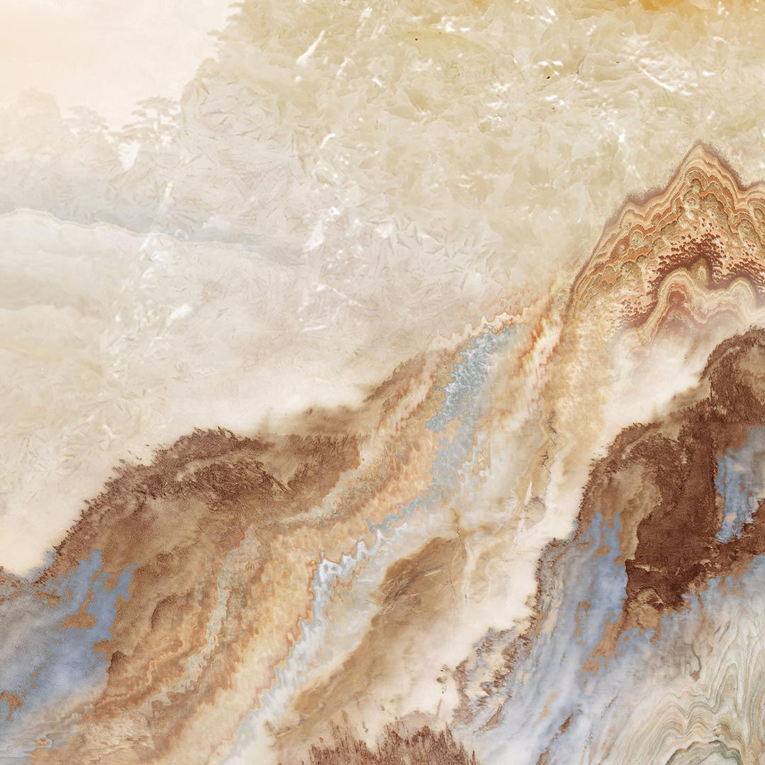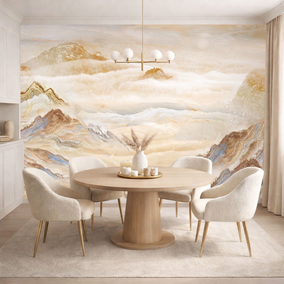 Beige and blue mural, mountain tops in clouds, painterly and boho style