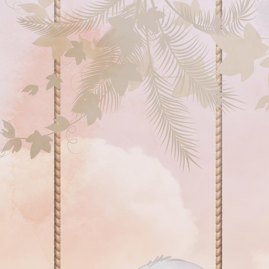 Beige and pink children's wallpaper, cheerful animals: an elephant, a panda bear, a giraffe and a bear swing on a rope wooden swing among ivy leaves. In a children's room with such a wallpaper every toddler will fall asleep smiling!