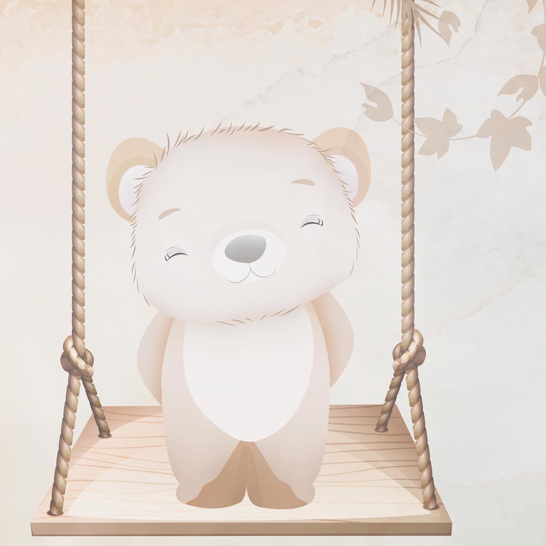 Beige children's wall mural, cheerful animals on a swing, elephant, panda, giraffe, bear