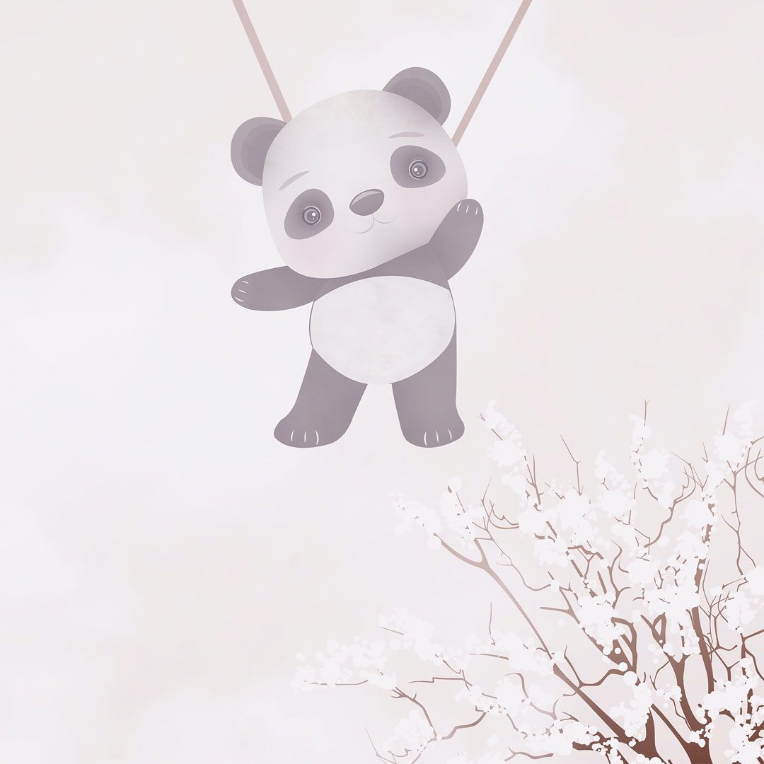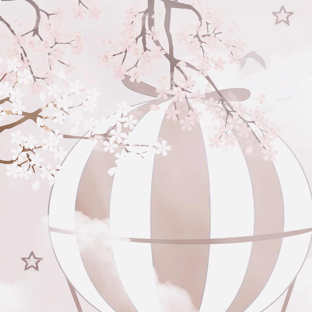 Pattern: flying balloons, elephant, bear, panda, birds in the sky, cherry blossom