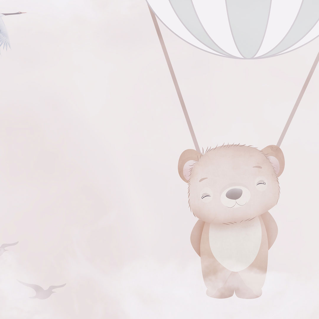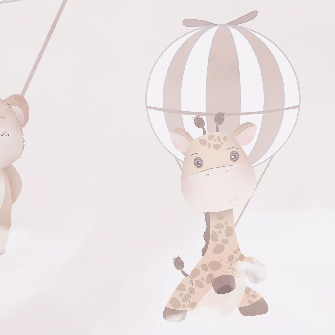 Beige wallpaper for children's room A BALLOON TRIP OF ANIMAL FRIENDS. The animals - an elephant, a teddy bear and a panda - have gone on a sky-high balloon trip. The sky shows flying birds, stars and, in the background, a tree and a cherry blossom. Pastel shades of beige and brown dominate.