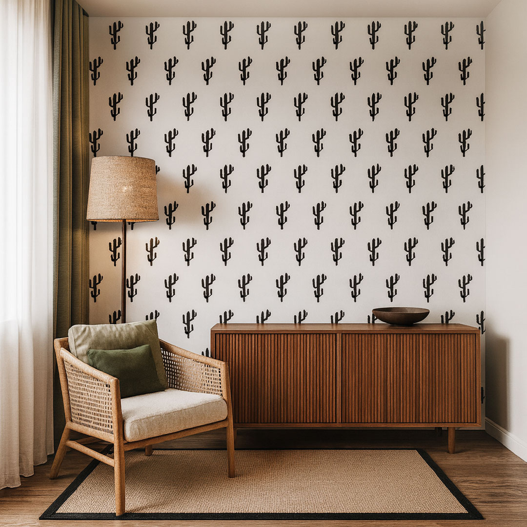 Black cactus design (10 x 20 cm) white wallpaper with vegetal pattern