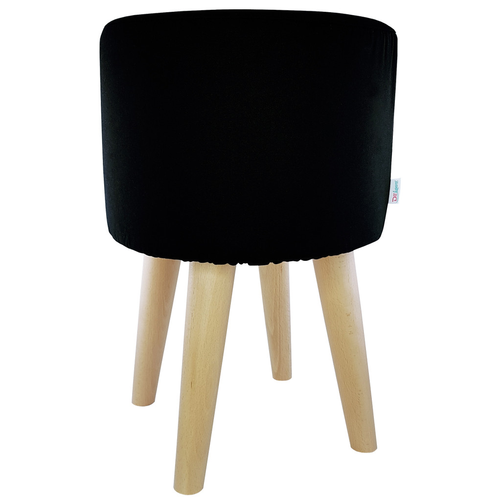 Black pouf round stool wooden legs velvety smooth cover