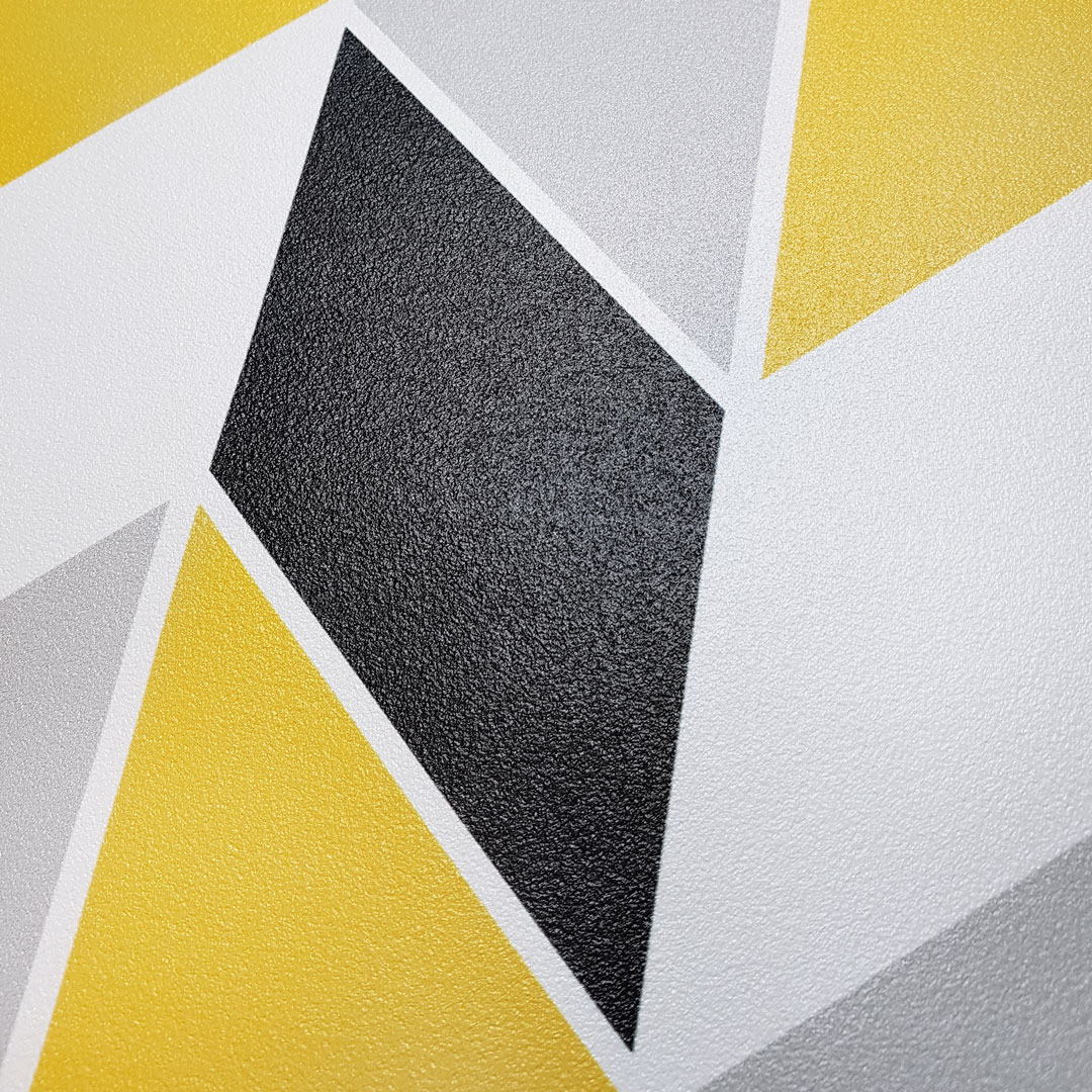 Modern, geometrical wallpaper with chevron herringbone in designer pattern with fashionable colours: black, yellow, grey and white. It matches to scandinavian style.