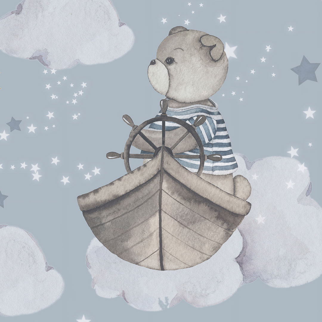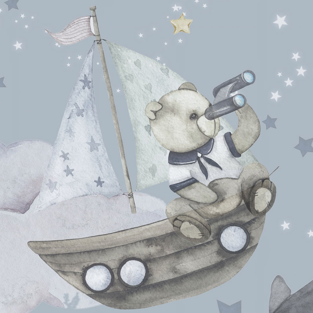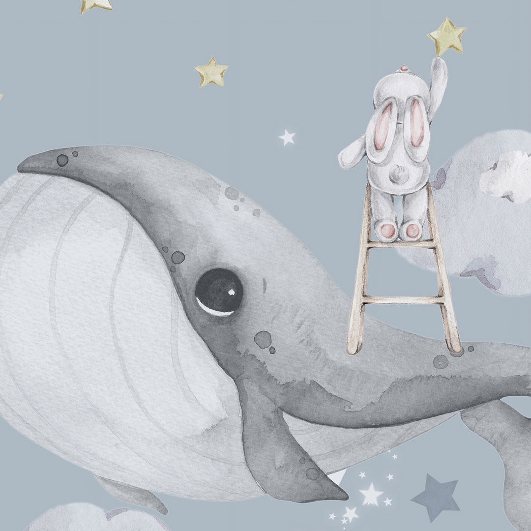 Beautiful children's wallpaper for a boy's or girl's room - star hunt. Pastel blue background (dirty blue) and watercolour grey and brown details. The fairytale scene shows whales and flying animals between the clouds. Our heroes, the cute animals, explore every bit of the pastel sky. Whales swim looking for adventure. Sailor bears sail boats looking out for bright stars through binoculars. Hares and rabbits catch stars directly from a flying balloon or collect them by standing on a ladder. A polar bear swings on a moon swing, a fox plays with balloons and a seagull rests on a cloud. Can you imagine a more adorable scene? We are sure that every little one will be happy in this company.