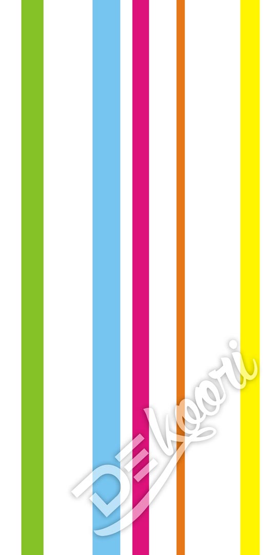 Modern, colourful decorative wallpaper with vertical stripes in five colour: green, blue, pink, orange, yellow. Trendy, designer and light project.