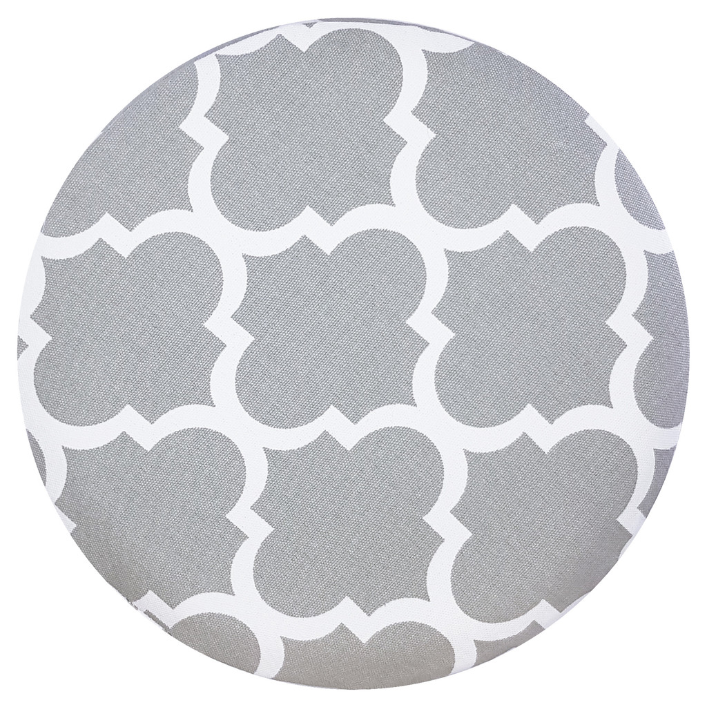 Grey round pouffe, wooden stool, white Moroccan clover pattern