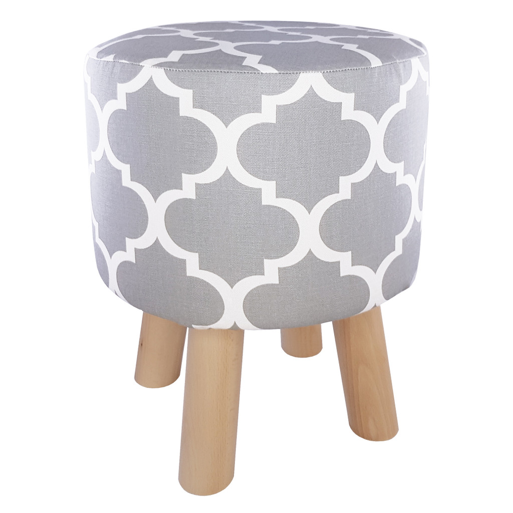 Wooden stool, round grey pouffe with seat with grey Moroccan clover pattern. Fits Scandinavian style and loft interiors.