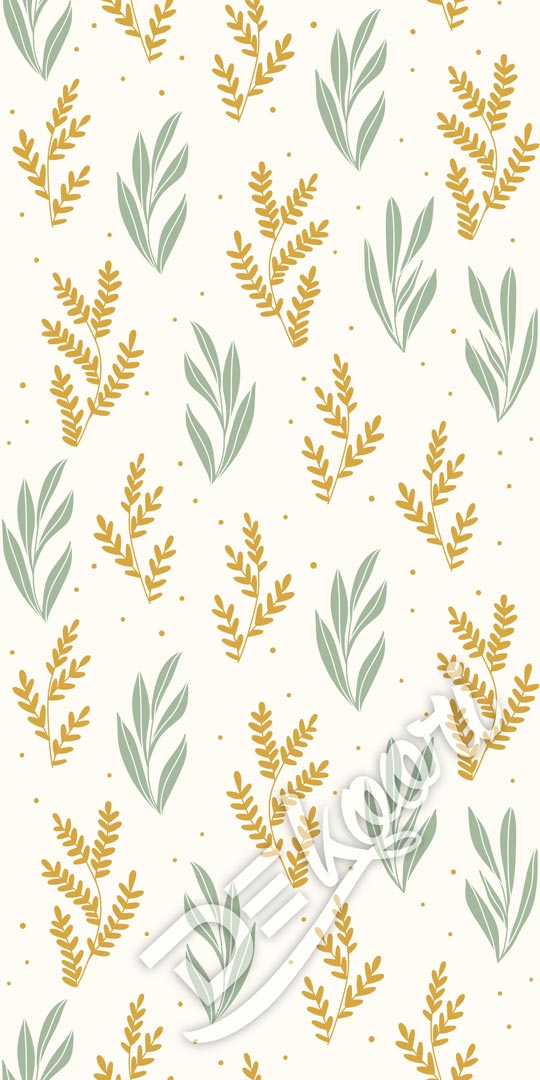 Scandinavian decorative wallpaper with botanical pattern of underwater plants in green and mustard colours on a delicate light yellow background. This wallpaper is a combination of vanguard boho style with modernity and with a jungle style which is quite fashionable in recent times.