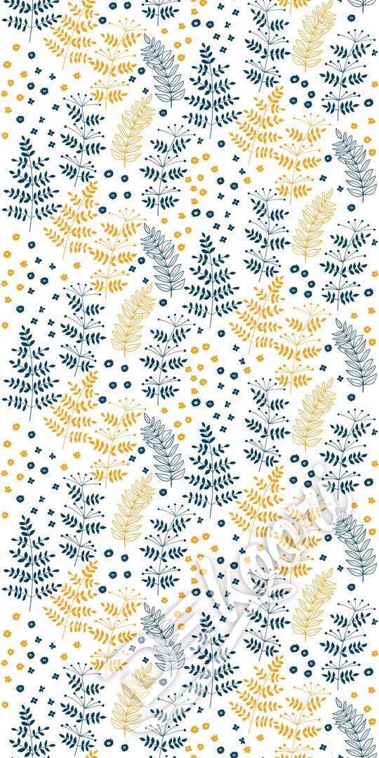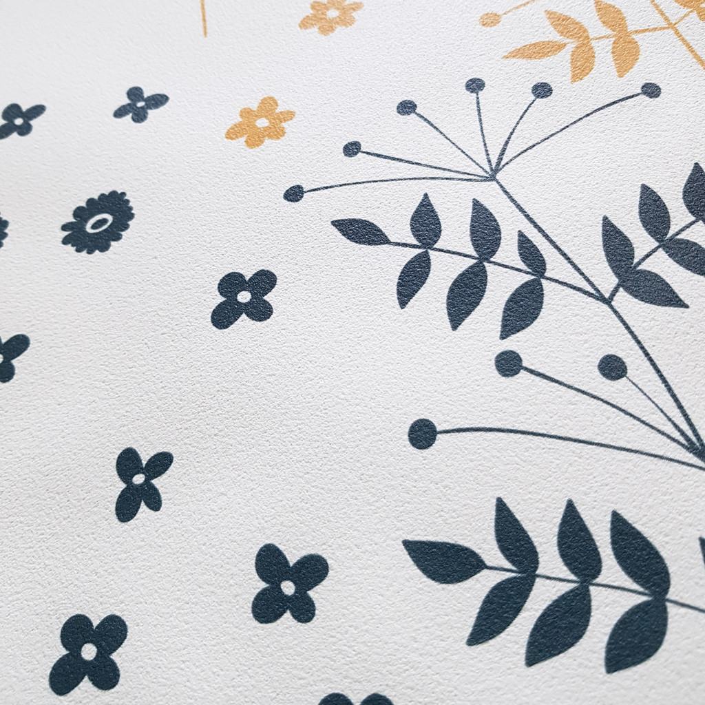 Designer white wallpaper with navy and orange vegetable motifs. This decoration is a combination of boho and Scandinavian styles. It joins a simplicity and amazing botanical pattern that will revive different types of interior.