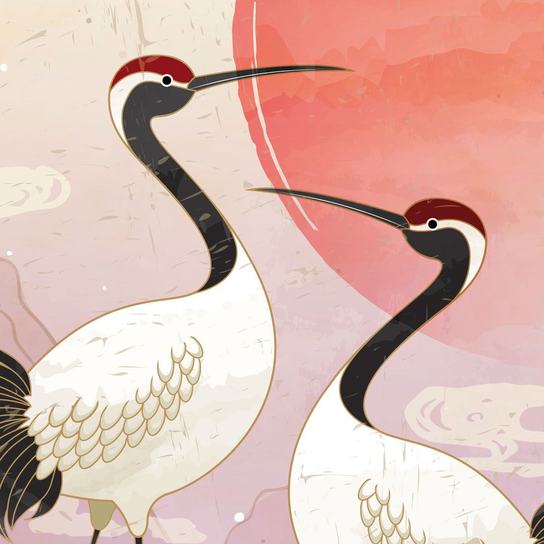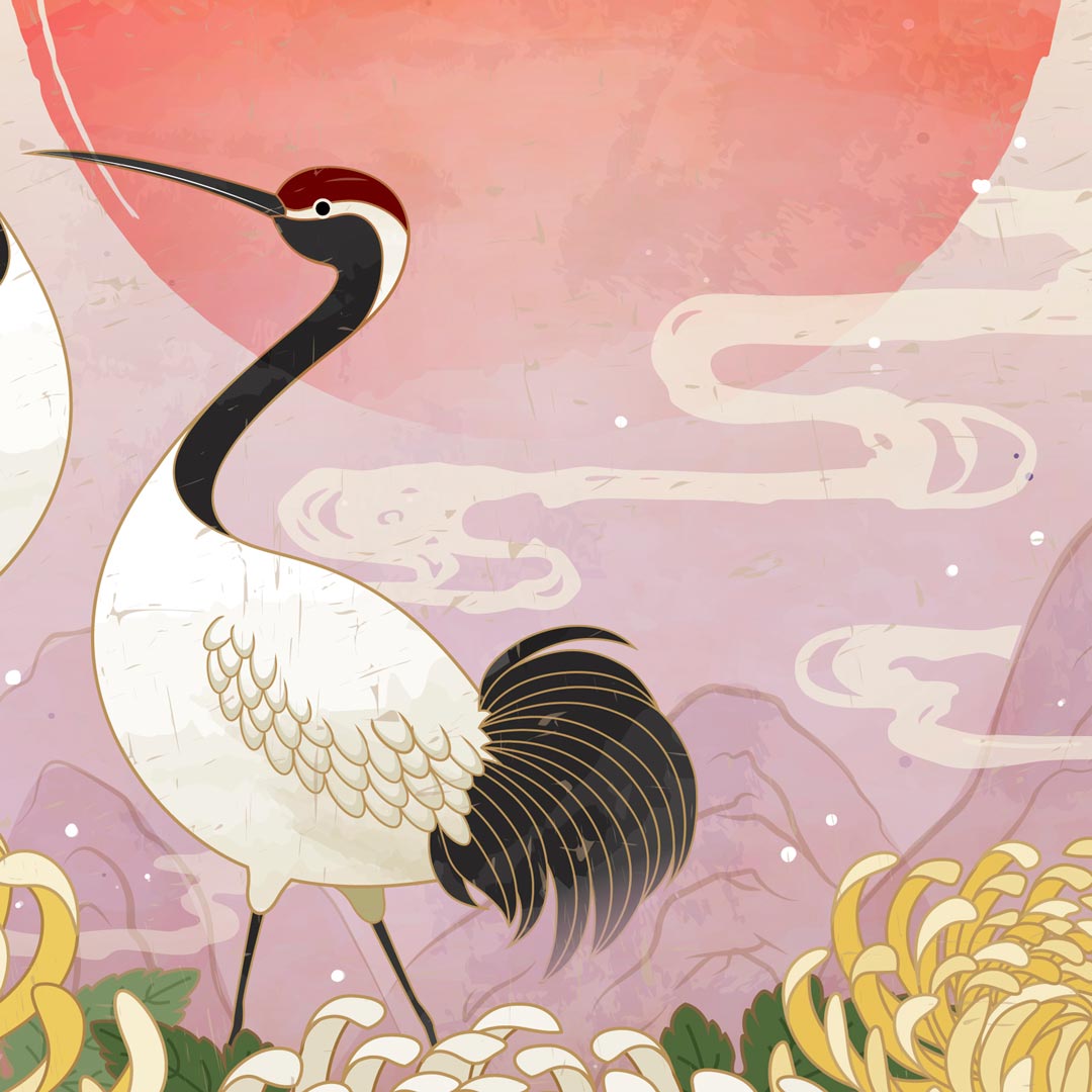 Oriental wallpaper done in a Japanese style with an aged effect. The graphic depicts herons on chrysanthemum flowers against a background of a red setting sun and mountains on the horizon.
