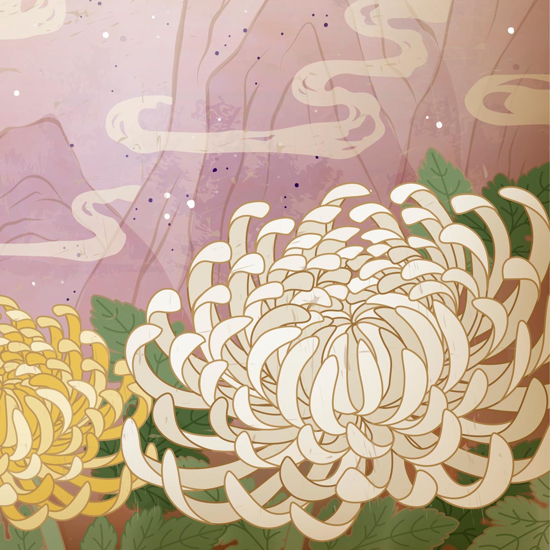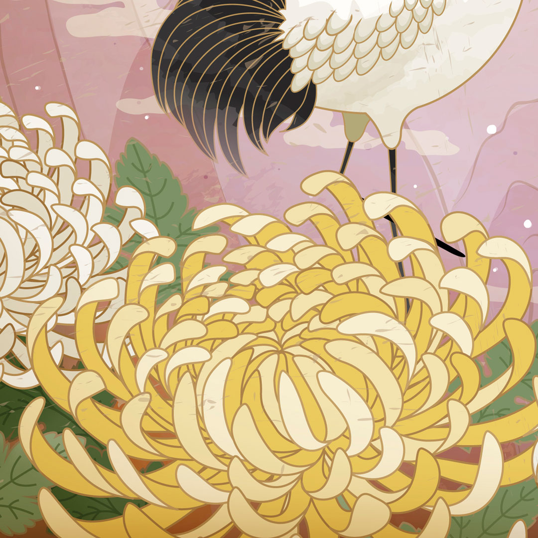 Oriental wallpaper, birds, herons, sunset, chrysanthemum flowers, Japanese style