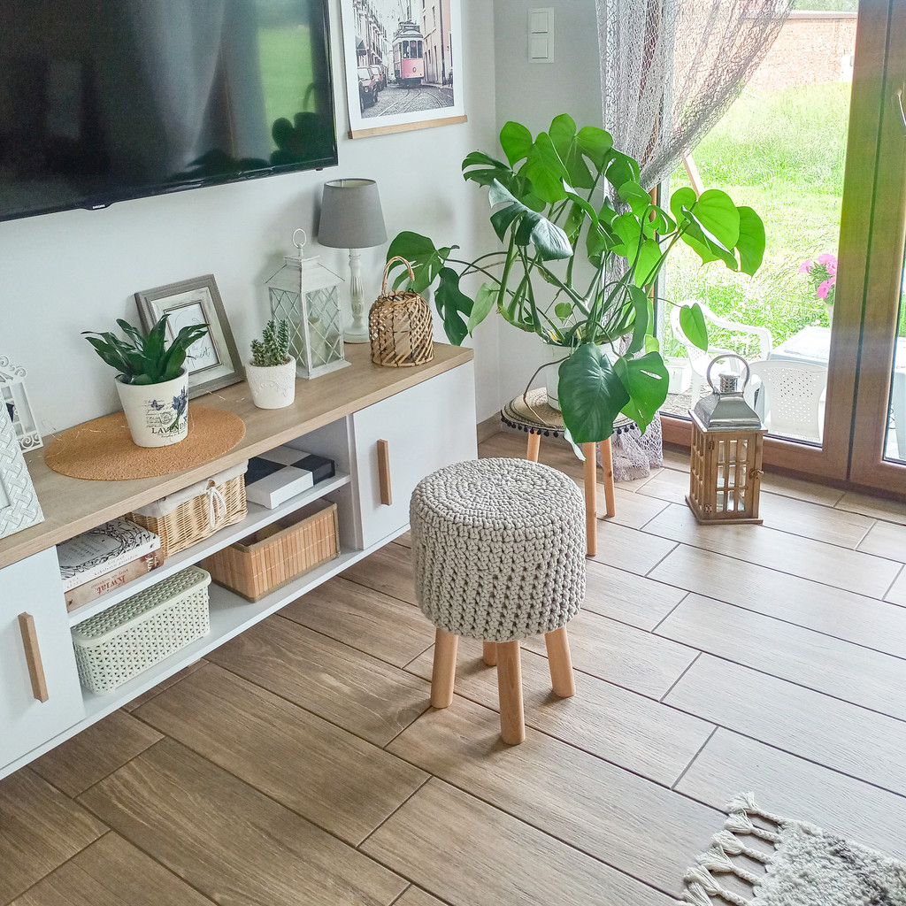 An elegant, very fashionable stool with a very warm and soft jumper cover. It is handmade from string using a crochet method, which makes it very unique. It will perfectly fit into rustic and Scandinavian interiors.