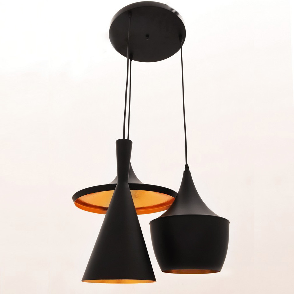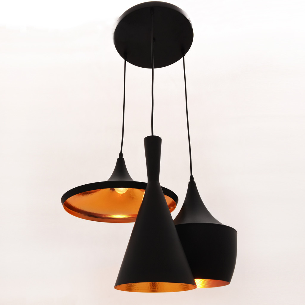 Modern and trendy pendant lamps composed of three elements. Industrial design in loft style. Made of aluminium, finished in matt black and gold.