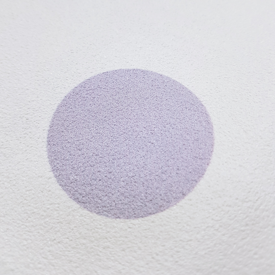 Colourful wallpaper with grey, blue and violet dots in a white background.