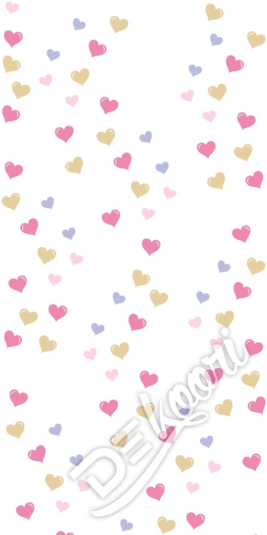 Lovely and colourful wallpaper for children, ideal for girl's room. White background and dark-pink, light-pink, beige and light-violet hearts in two sizes. Wallpaper is washable and you can use it in every room.