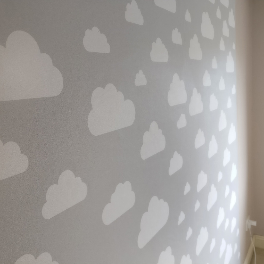 Grey and white wallpaper with clouds in various sizes. Universal pattern which matches to different rooms. Perfectly it will work in children's rooms.