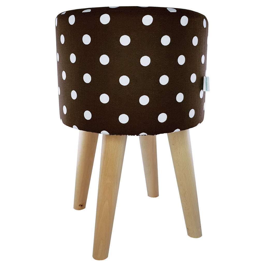 Wooden stool with soft chocolate brown and white seat with dotted, pea pattern.
